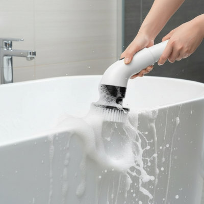 Salle de bain : Parois de douche, baignoire, robinetterie... La brosse électrique élimine le calcaire et le savon incrustés sans abîmer les surfaces.